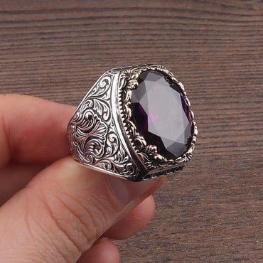 Kalem İşlemeli Ametist Taşlı Gümüş Yüzük