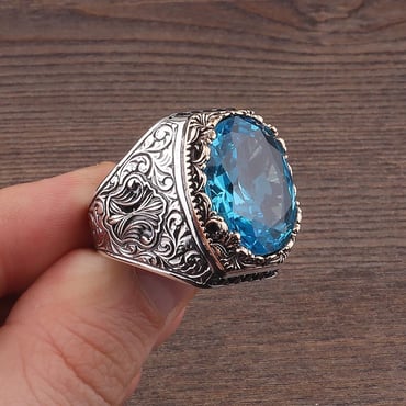 Rölyef Desenli Blue Topaz Taşlı Yüzük