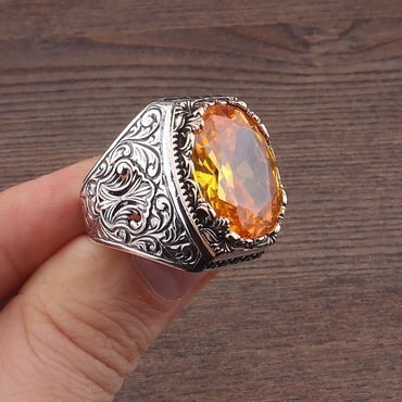 Kalem İşlemeli Sitrin Taşlı Gümüş Yüzük