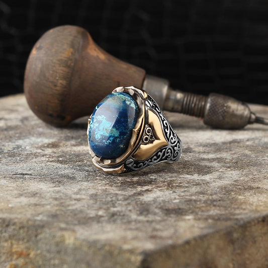 Kalem İşlemeli Aqua Taşlı Gümüş Yüzük