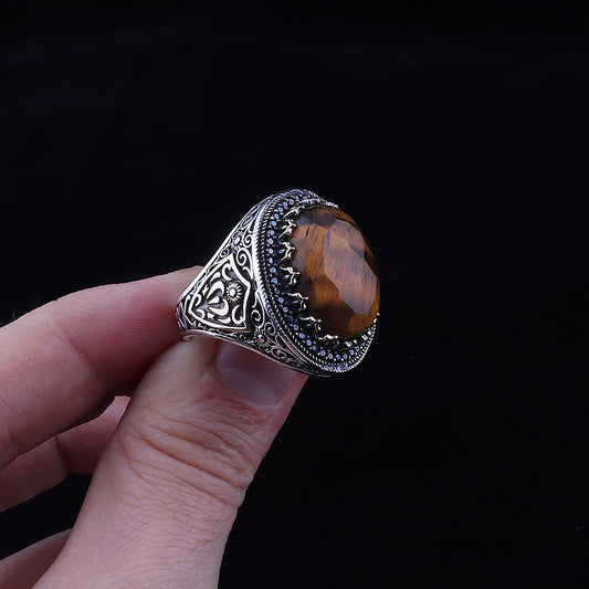 Doğal Kaplan Gözü Taşlı Gümüş Yüzük